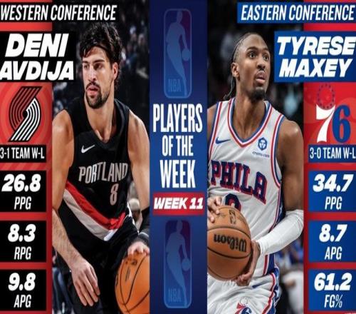 NBA官方公布了第11周的东西部周最佳球员,东部由76人后卫马克西当选,西部由开拓者前锋阿夫迪亚当选。马克西上周场均豪取34.7分+6.7篮板+8.7助攻,命中率高达61.2%,带领76人取得3胜0负的战绩。据统计,这是马克西本赛季第2次拿到周最佳,也是生涯第4次斩获该奖项。阿夫迪亚上周场均贡献26.8分+8.3篮板+9.8助攻,带领开拓者取得3胜1负的战绩。据统计,这是阿夫迪亚职业生涯首次斩获周最佳,上一位拿到该奖项的开拓者球员还是利拉德。除此之外,字母哥、班凯罗、布朗、康宁汉姆、小卡、布克、库里、杜兰特、华子和SGA等球星获得了周最佳提名。