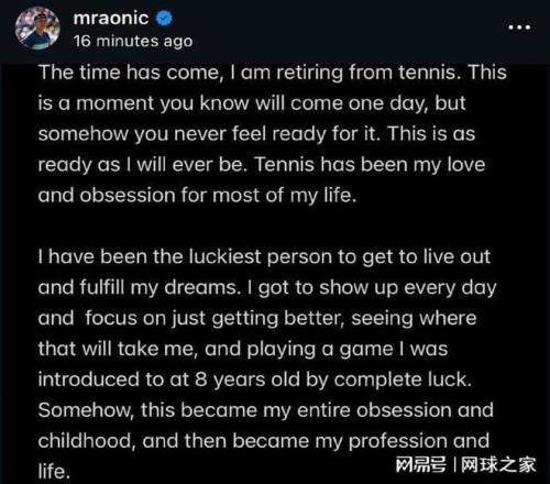 北京时间今晨,加拿大名将米洛斯-拉奥尼奇在个人社交媒体上发文,宣布结束自己的网球生涯正式退役。35岁的拉奥尼奇有“加拿大火炮”、“拉神”之称,曾在2016年打进温网决赛收获亚军,创造了加拿大男网的历史,最高世界排名来到过第三位,获得过92场大满贯的胜利,在90后球员中仅次于小兹维列夫和迪米特洛夫。过去几个赛季,拉奥尼奇始终受伤病困扰,偶有复出也是以失利告终。如今看来,他的伤病已经到了非常严重的程度,无法再支撑他征战职业赛场了。再见了拉神!祝他退役之后的生活一切都好!